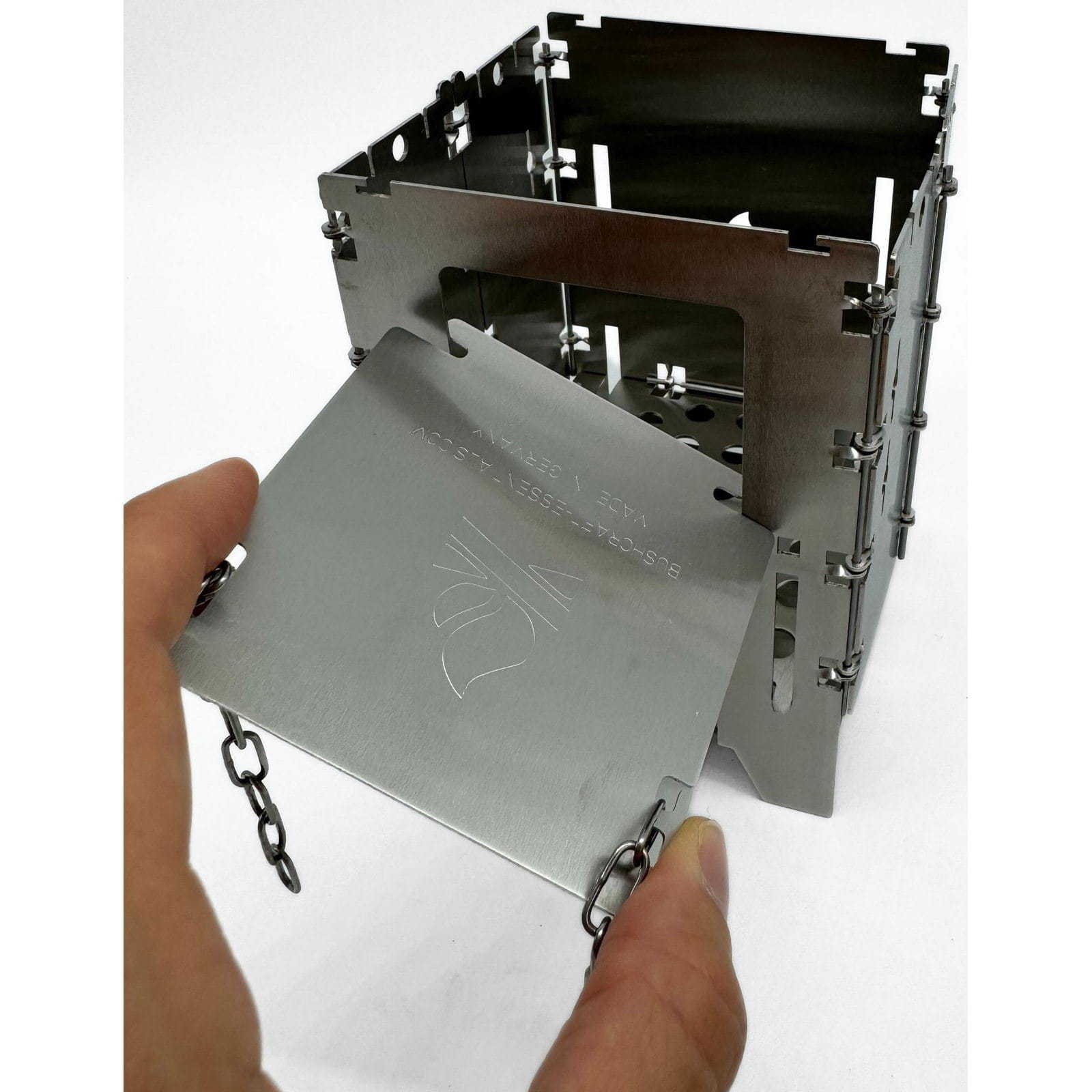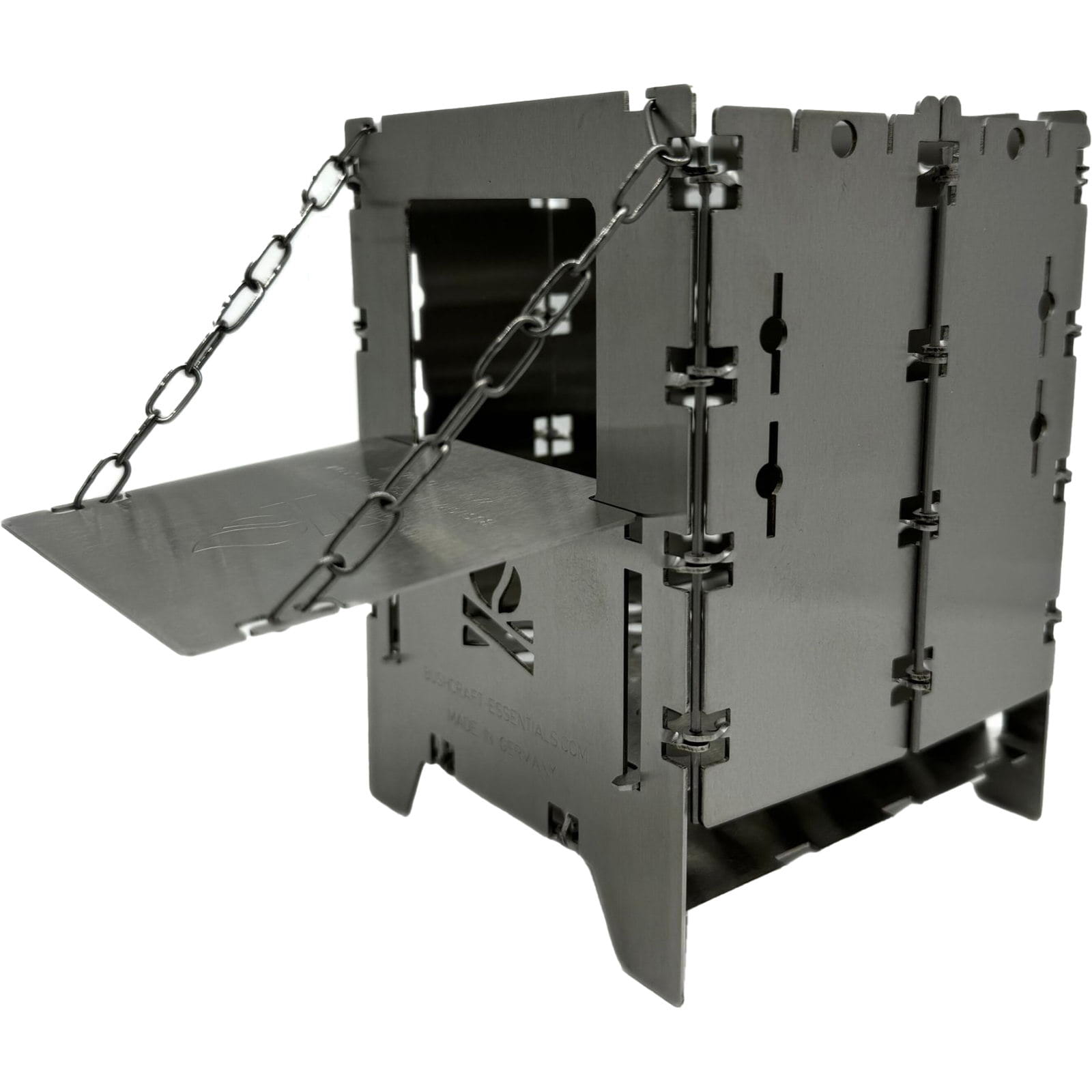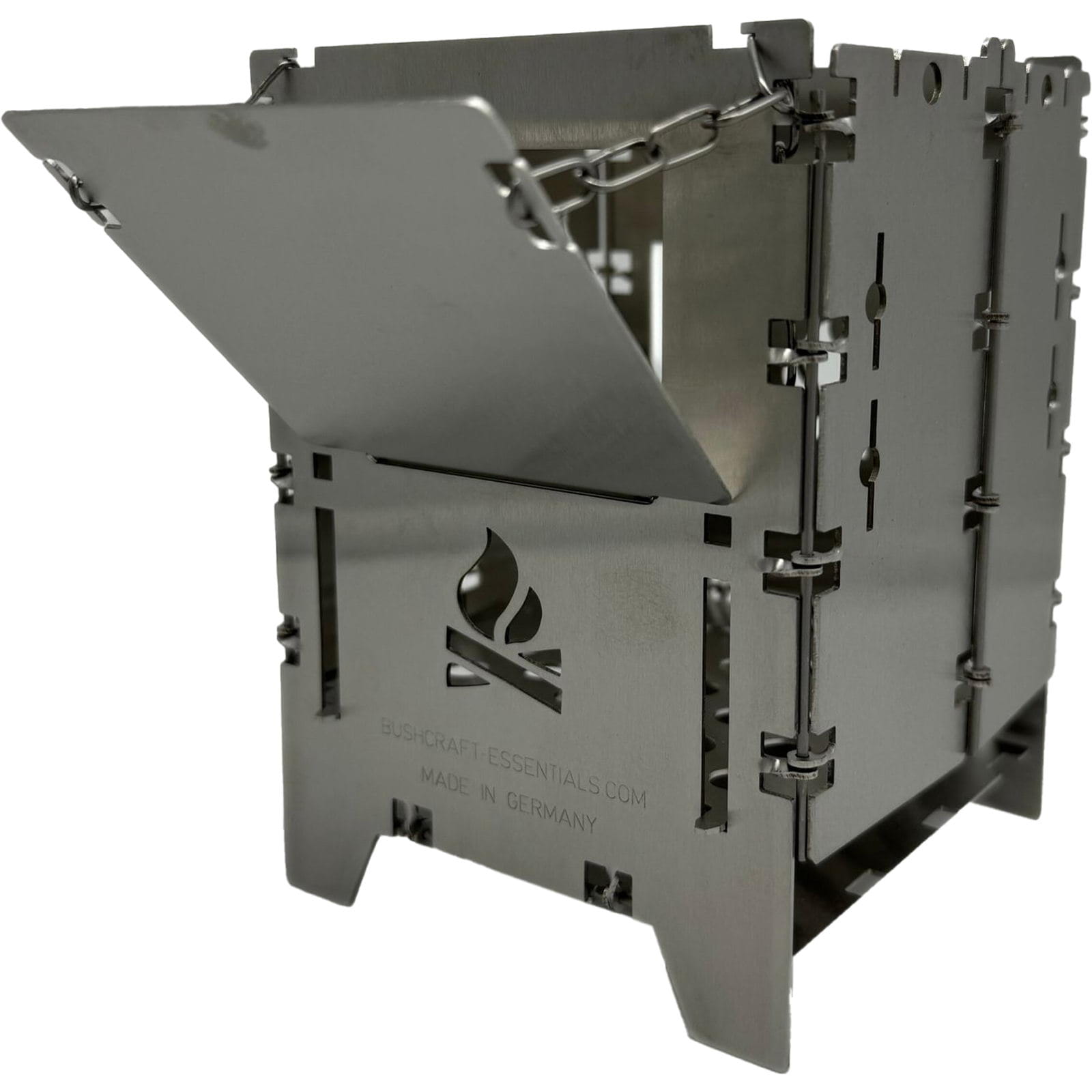 Die Holzrutsche Bushbox LF Titanium von bushcraft essentials erleichtert das Kochen und sorgt für ein entspanntes Feuererlebnis, indem sie das Brennholz automatisch in den Brennraum der Bushbox LF nachrutschen lässt. Längere Äste oder Holzscheite können bereits zu Beginn eingelegt werden, sodass ein ständiges Nachlegen entfällt. Die Holzrutsche aus Titan wird schräg in das Brennstofffenster der Bushbox LF eingeführt und horizontal aufgelegt. Mit der angebrachten Kette kann der Neigungswinkel eingestellt werden, um sicherzustellen, dass das Brennholz nachrutscht und die Bushbox LF stabil bleibt. Je nach Holzgröße sollte der Winkel angepasst werden. Das Feuer wird wie gewohnt entzündet, und das Holz rutscht im Laufe der Verbrennung selbstständig nach. Die Rutsche kann flach eingestellt auch als Plattform zum Warmhalten von Getränken genutzt werden. Achtung: Die Edelstahl-Kette ist hitzebeständig, wird aber heiß und sollte daher nur mit Handschuhen angefasst werden. Gegebenenfalls kann es zwischendurch nötig sein, den Brennstoff händisch etwas nachzuschieben, damit er gleichmäßig abbrennt und nicht versehentlich außerhalb der Bushbox Feuer fängt.