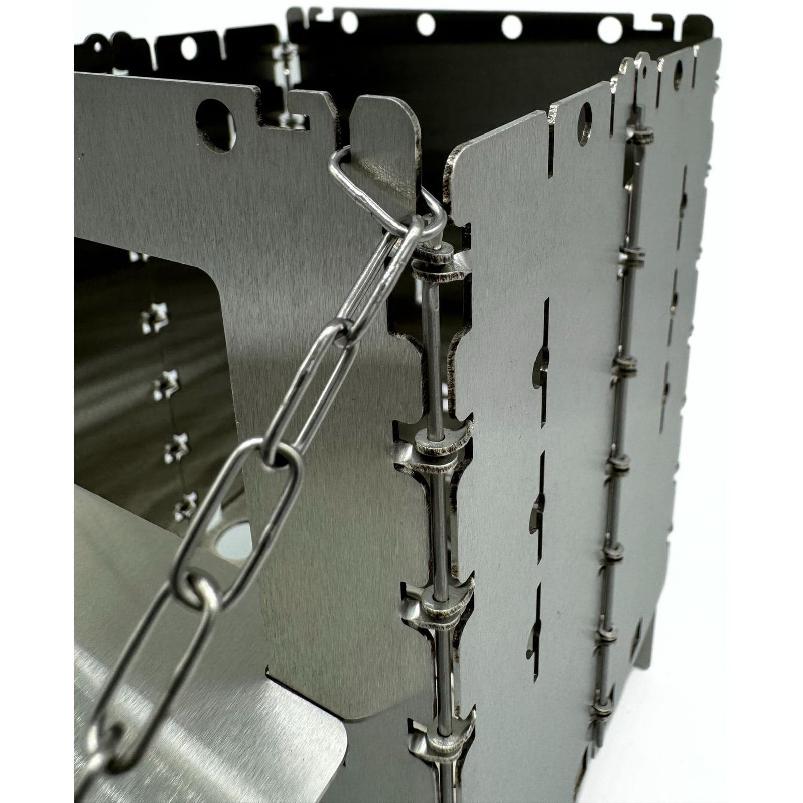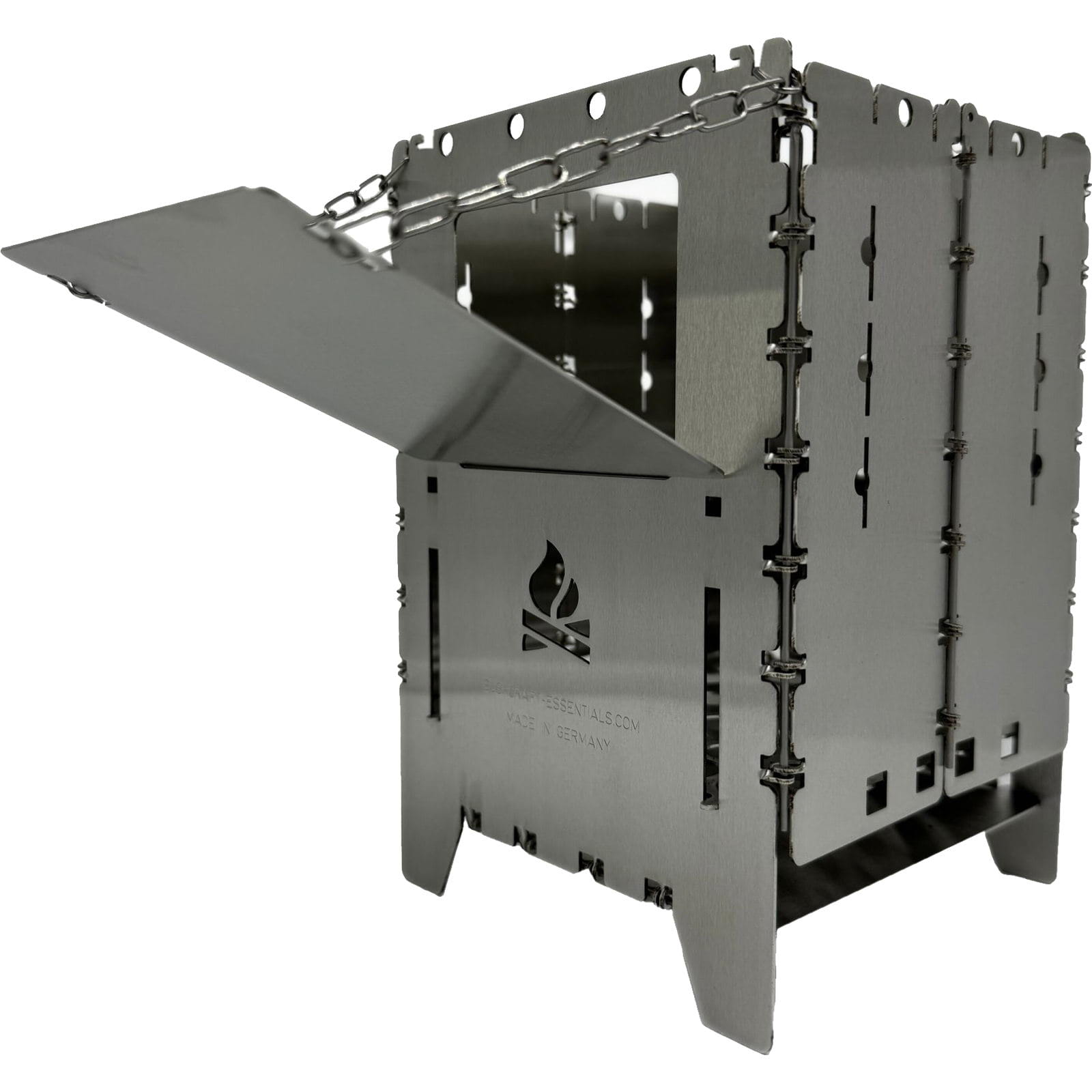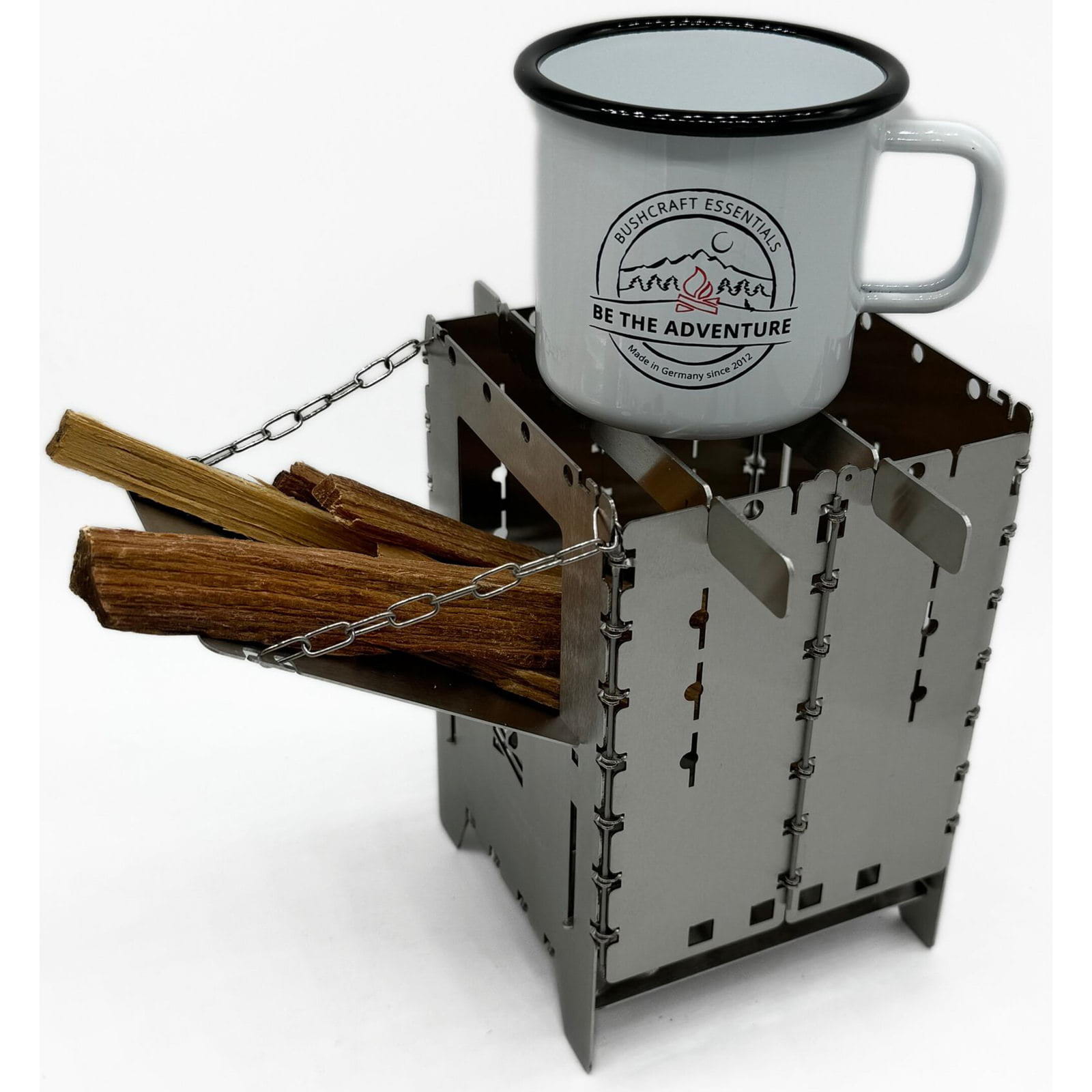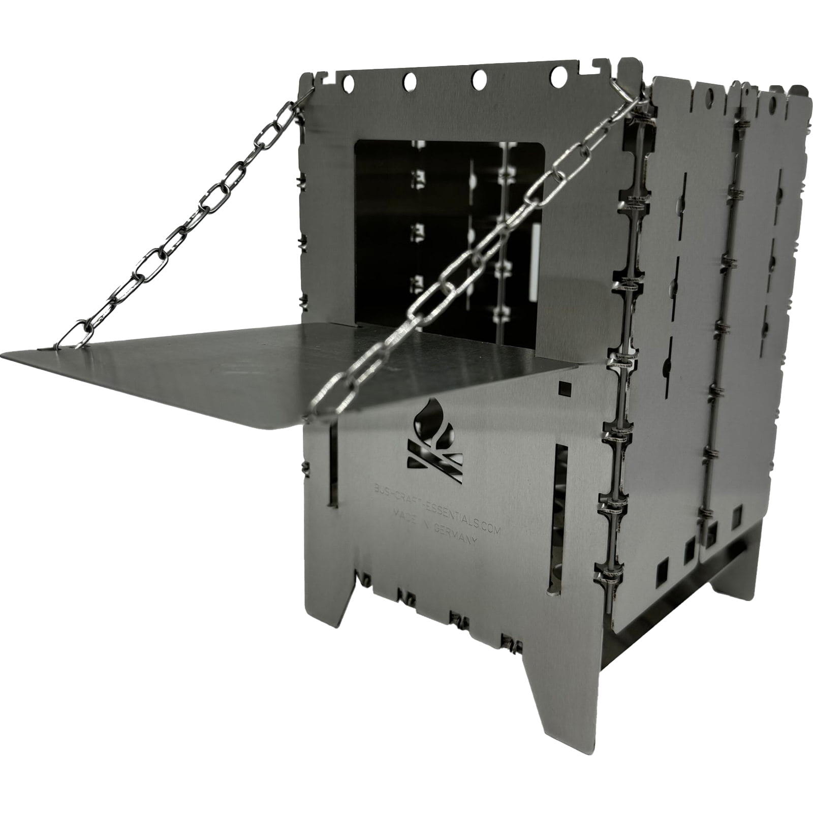 Die Holzrutsche Bushbox XL Edelstahl von bushcraft essentials erleichtert das Kochen und sorgt für ein entspanntes Feuererlebnis, indem sie das Brennholz automatisch in den Brennraum der Bushbox XL nachrutschen lässt. Längere Äste oder Holzscheite können bereits zu Beginn eingelegt werden, sodass ein ständiges Nachlegen entfällt. Die Holzrutsche aus Edelstahl wird schräg in das Brennstofffenster der Bushbox XL eingeführt und horizontal aufgelegt. Mit der angebrachten Kette kann der Neigungswinkel eingestellt werden, um sicherzustellen, dass das Brennholz nachrutscht und die Bushbox XL stabil bleibt. Je nach Holzgröße sollte der Winkel angepasst werden. Das Feuer wird wie gewohnt entzündet, und das Holz rutscht im Laufe der Verbrennung selbstständig nach. Die Rutsche kann flach eingestellt auch als Plattform zum Warmhalten von Getränken genutzt werden. Achtung: Die Edelstahl-Kette ist hitzebeständig, wird aber heiß und sollte daher nur mit Handschuhen angefasst werden. Gegebenenfalls kann es zwischendurch nötig sein, den Brennstoff händisch etwas nachzuschieben, damit er gleichmäßig abbrennt und nicht versehentlich außerhalb der Bushbox XL Feuer fängt.