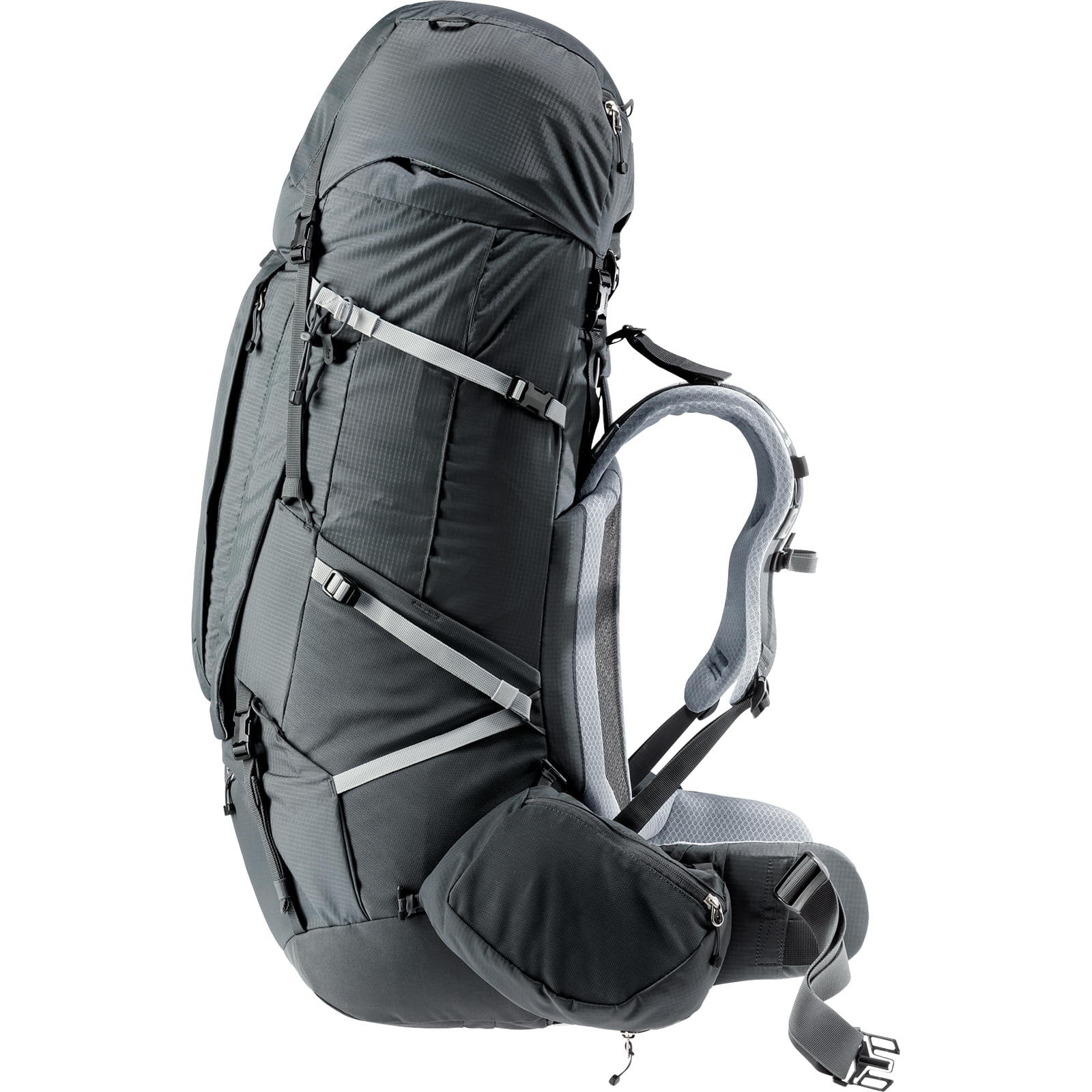 Der Aircontact Pro 75+10 SL von deuter für Damen ist ein wahres Organisationstalent, ausgestattet mit zahlreichen Fächern und Taschen für eine gut durchdachte Ordnung und einen schnellen Zugriff auf die Ausrüstung. Das Aircontact-Rückensystem ist dank verstellbarer VariSlide-Rückenlänge, passgenauer VariFlex-Hüftflossen und beweglicher ActiveFit-Schulterträger auf die Größe der Trägerin optimierbar und dank stabilem Aluminium-Y-Rahmen und Lumbal-Pad mit atmungsaktivem Air-Spacer-Mesh angenehm zu tragen. Das Tragesystem der SL-Version ist speziell an die weibliche Anatomie angepasst. Der Trekkingrucksack verfügt über ein Volumen von 75 Litern, das durch den höhenverstellbaren Deckel um weitere 10 Liter erweitert werden kann. Zusätzlich bieten die geräumigen, abnehmbaren 3 Liter Hüftflossentaschen Platz für persönliche Gegenstände, die schnell griffbereit sein müssen. Auch eine 1,5-Liter-Trinkflasche kann hier in einer zusätzlich ausklappbaren Tasche verstaut werden. Der Trekkingrucksack ist mit abnehmbaren Kompressionsriemen ausgestattet, die je nach Einsatz und Ausrüstung angepasst werden können, um verschiedene Gegenstände zu befestigen. Der abnehmbare Deckel lässt sich mit den zusätzlich mitgelieferten Schulterträgern im Handumdrehen in einen Daypack verwandeln. Der Zugriff auf das Hauptfach ist sowohl von oben, über das separate Bodenfach als auch über eine große U-förmige Frontöffnung möglich, so dass der Inhalt des Rucksacks leicht zu erreichen ist. Die Innentaschen sorgen für Ordnung und zwei elastische Außentaschen bieten einen schnellen Zugriff auf Trinkflasche oder Energieriegel. Zwei Balg-Außentaschen bieten Platz für zusätzliches Gepäck und helfen, Ordnung zu halten, eine davon ist extra lang und eignet sich ideal für Zeltgestänge. Das abriebfeste Außenmaterial und die robusten, größeren Bauteile machen den Aircontact Pro 75+10 SL besonders widerstandsfähig gegen Abnutzung, Verschleiß und Witterungseinflüsse.