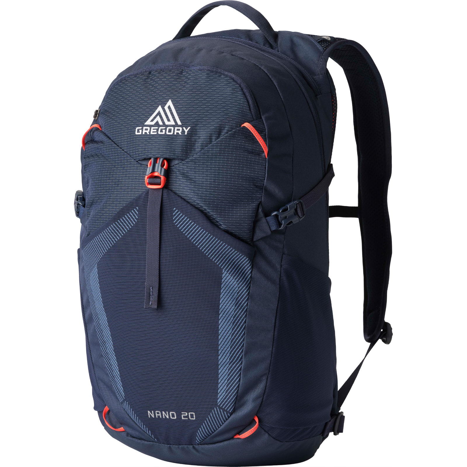 Der Nano 20 von Gregory ist ein komfortabler und atmungsaktiver Tagesrucksack, inspiriert von der Bergwelt und damit der perfekte Begleiter für jeden Tag. Der Tagesrucksack bietet ein geräumiges Hauptfach mit Reißverschluss sowie zwei seitliche Kompressionsriemen mit Schnellverschluss, die für eine stabile und sichere Aufbewahrung sorgen. Die schnell zugängliche Fronttasche mit Reißverschluss bietet Platz für kleinere Gegenstände und ist zusätzlich mit einem Schlüsselhalter und Organisationsfächern ausgestattet. Die Fronttasche aus elastischem Mesh mit sicherem Schnallenverschluss bietet zusätzlichen Stauraum und sorgt für Ordnung. Besonders praktisch ist das separate Reißverschlussfach am Rücken, das entweder ein Trinksystem für Wanderungen oder ein Tablet bzw. einen kleineren Laptop aufnehmen kann, wenn man in der Stadt unterwegs ist. Zwei Seitentaschen aus elastischem Mesh bieten Platz für Trinkflaschen und andere Gegenstände, die schnell griffbereit sein sollen. Der atmungsaktive Airmesh-Schultergurt mit einhändig bedienbarer Brustgurtschnalle und Führungsschlaufen für das Trinksystem sorgt für hohen Tragekomfort. Das atmungsaktive, formgestanzte Rückenteil gewährleistet eine gute Belüftung. Reflektierende Befestigungsschlaufen aus Gurtband und geformte Zipper mit Komfortgriff runden das praktische Design ab. Der vielseitige Nano 20 ist einfach ein Allrounder.
