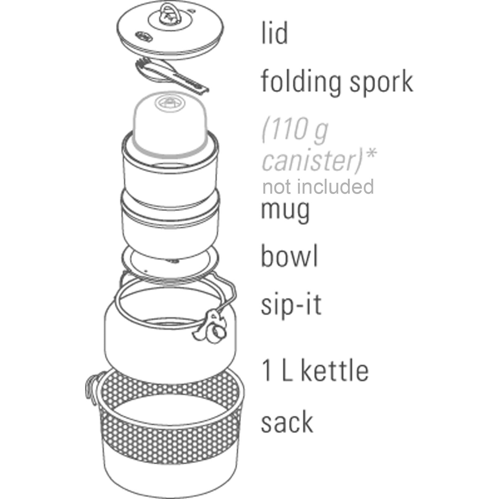 Das Halulite Ketalist von GSI ist ein leichtes und effizientes Koch- und Geschirrset mit einem Wasserkessel aus hart anodisiertem Aluminium. Das Set bietet im Inneren Platz für eine Gaskartusche und einen kleinen Gaskocher (nicht im Lieferumfang enthalten!). Das Set besteht aus einem 1-Liter-Wasserkessel, einer Schüssel, einem Becher mit Sip-It-Deckel und Isolierhülle, einem ausklappbaren Göffel (Gabel/Löffelkombination) sowie einem Packsack. Der Wasserkessel mit 1 Liter Volumen (wegen Ausguss nur mit 750 ml befüllbar) ist aus hart anodisiertem Aluminium gefertigt und kommt mit praktischem Klappgriff und Deckel. Der clevere, faltbare Göffel lässt sich auf eine Länge von nur 10 cm zusammenklappen und ist somit ideal für unterwegs. Ein mitgelieferter Packsack dient zur Aufbewahrung des Sets.