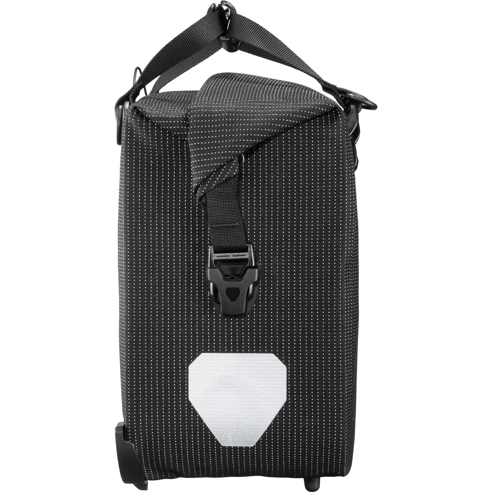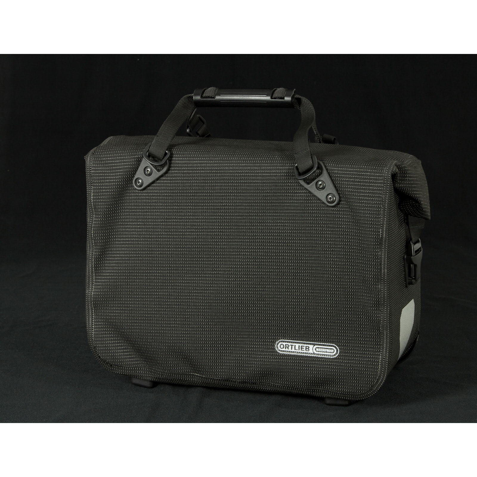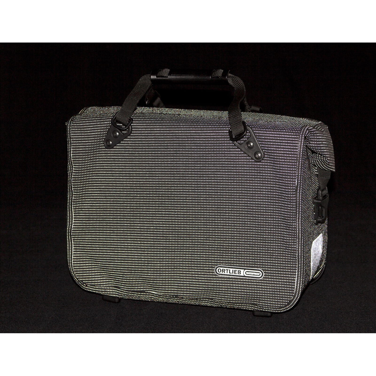 Der Office-Bag High-Vis 21 L (Name bis 2023 Office-Bag High Visibility) von Ortlieb ist eine wasserdichte Fahrradaktentasche mit eingewebtem Reflexgarn aus der High Visibility Linie. Tagsüber gibt sich der Office-Bag passend zum Business-Outfit dezent zurückhaltend in edlem Schwarz. Doch kaum wird es dunkel, verwandelt er sich in einen leuchtstarken Begleiter. Denn bei der schicken Fahrradaktentasche kommt ein Corduragewebe zum Einsatz, das komplett mit einem Reflexgarn durchzogen ist. Angestrahlt von einem Scheinwerfer leuchten so nicht nur die ORTLIEB-typischen Reflektoren, sondern der komplette Taschenkörper. Mit einem Volumen von 21 Litern schluckt die Tasche problemlos einen großen Ordner und Laptop, sowie die für den Berufsalltag notwendigen Kleinigkeiten wie Terminplaner, Smartphone, Thermoskanne und Co. Dabei sorgen zwei unterteilte Innentaschen für die nötige Übersicht. Der wasser- und staubdichte Rollverschluss gewährleistet einen sicheren Transport, egal bei welchem Wetter. Ein noch komfortableres und schnelleres Einhängen der Radtasche ermöglicht das QL3.1-Halterungssystem. Die Tasche wird lediglich am unteren Aufnahmepunkt aufgesetzt, an den Gepäckträger herangeführt und mit einer seitlichen Bewegung von links oder rechts eingeschwenkt und sicher an den beiden oberen Aufnahmen arretiert. Genauso schnell und leicht funktioniert das Abnehmen, einfach Tasche am Griff anheben und gleichzeitig entweder nach links oder rechts schwenken, fertig. Zwei großflächige und leuchtstarke Reflektoren sorgen für zusätzliche Sicherheit in Dämmerung und Dunkelheit. Abstellfüße und Kantenschutz an den Ecken schützen den Taschenboden.