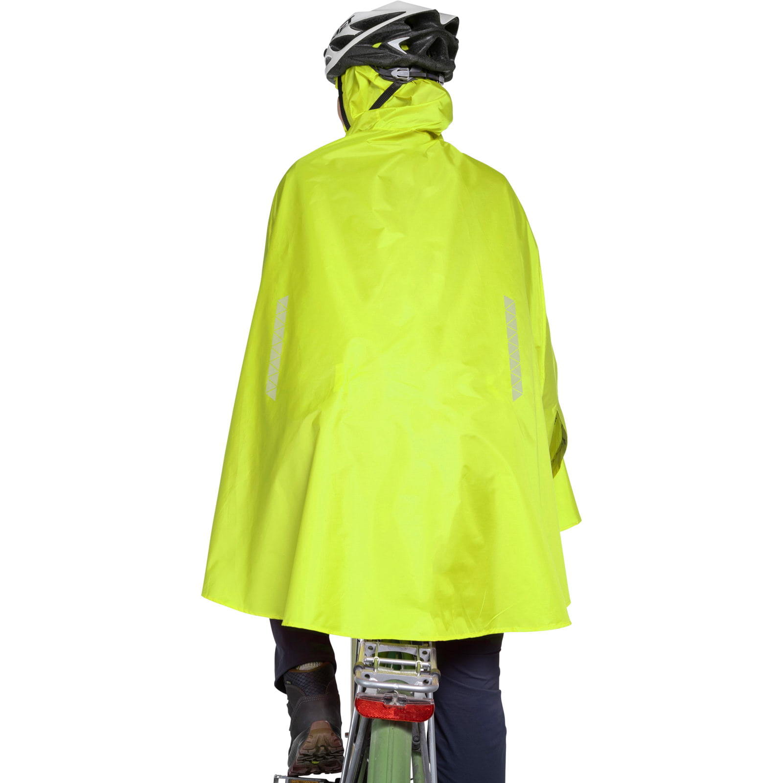 Der wasserdichte Bike Poncho von Tatonka schützt zuverlässig auf dem Fahrrad bei Regen, Wind und Schnee. Der Fahrrad-Regenponcho besitzt eine funktionelle Kapuze mit Schnürzug und Kordelstopper, die über oder unter dem Fahrradhelm getragen werden kann. Innen befinden sich ein elastisches Taillenband zur Fixierung, zwei große Schlaufen für die Daumen und zwei Eingriffe, durch die man die Hände stecken kann. Ein Sichtfenster im Vorderteil des Ponchos sorgt dafür, dass das Fahrradlicht nicht verdeckt wird. Zudem sind das Vorder- und das Rückenteil mit reflektierenden Bereichen versehen. Das Regencape kann im mitgelieferten Packbeutel klein verstaut werden und besteht zu 100% aus recycelten Materialien. Ein kleiner Rucksack passt mit unter das Regencape.