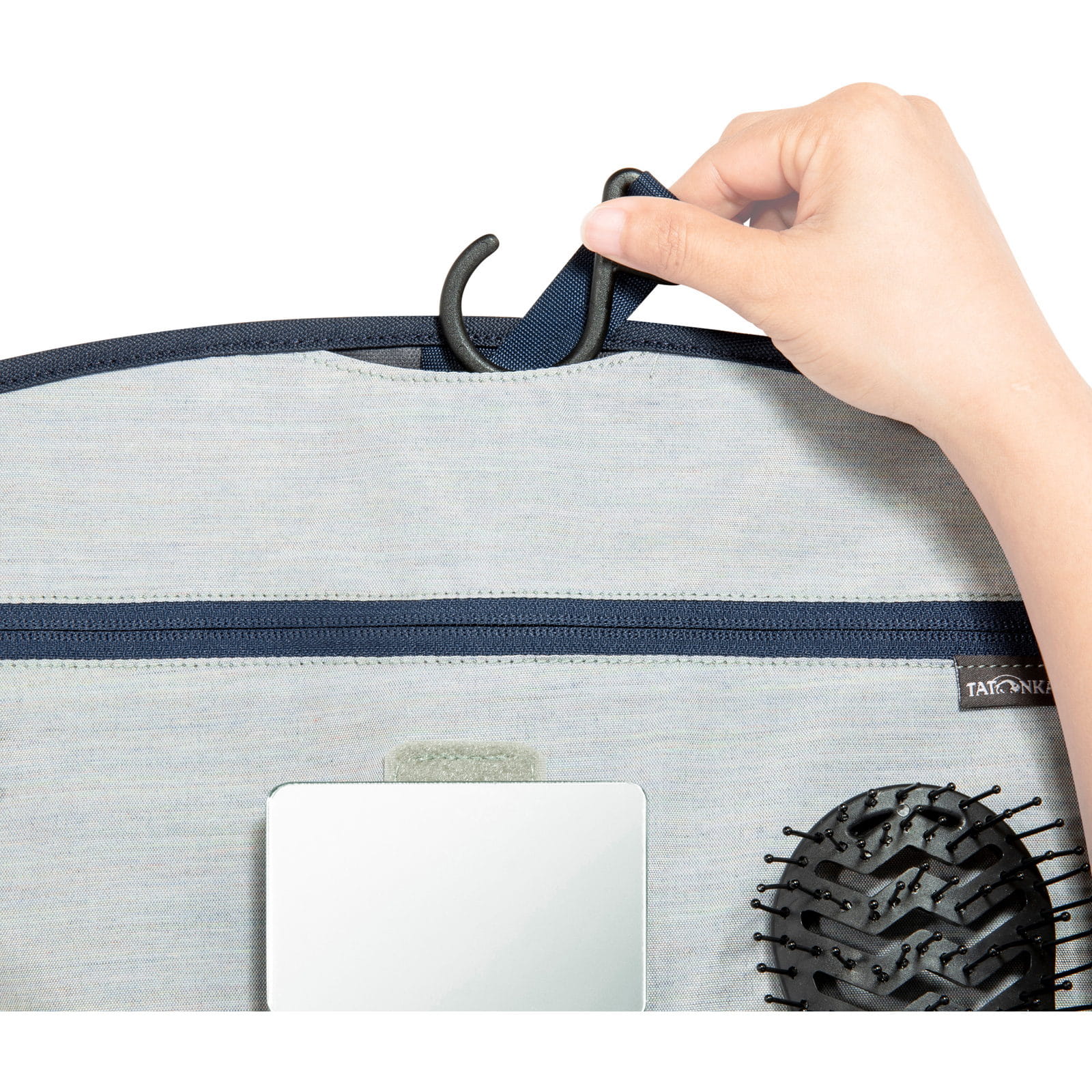 Die große, faltbare Kulturtasche Travelcare von Tatonka bietet viel Platz für Pflegeutensilie und sorgt mit unterschiedlichen Fächern für Ordnung. Aufgeklappt bietet sie zwei große Reißverschlussfächer, vier praktische Einstecktaschen sowie einen abnehmbaren Spiegel. Ein verstaubarer Aufhängehaken ermöglicht zudem das bequeme Aufhängen, sodass alle Utensilien stets griffbereit sind.